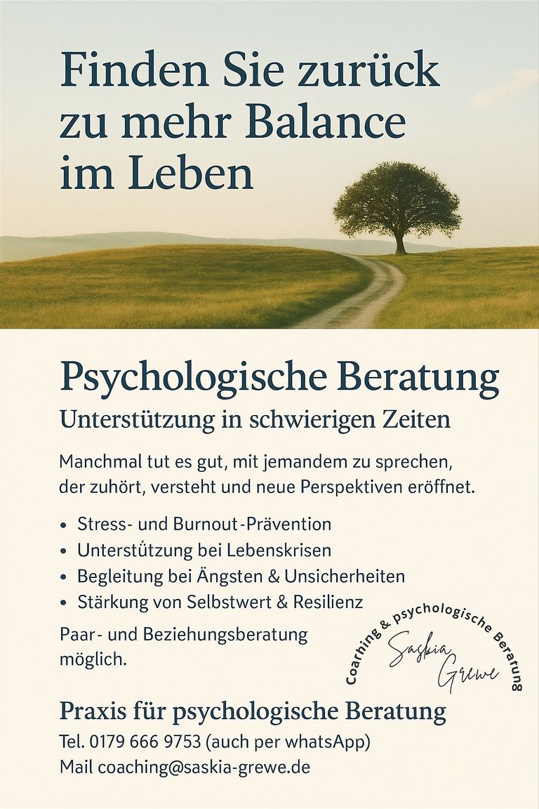 In belastenden Lebensphasen brauchen Sie jemanden, der zuhört, unterstützt und hilft, wieder klare Gedanken zu fassen. In meiner psychologische Beratung biete Ich Ihnen einen geschützten Raum, in dem Sie sich verstanden fühlen – professionell, emphatisch und lösungsorientiert.